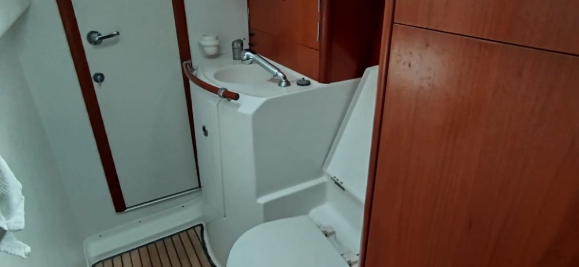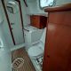 - Cabinet de toilette : en coursive tribord, douche séparée, lavabo polyester, WC marin Jabsco, placards et miroirs, hauteur sous barrot 1,86 m.
