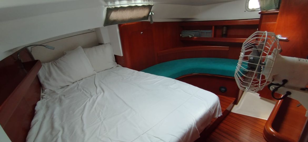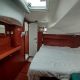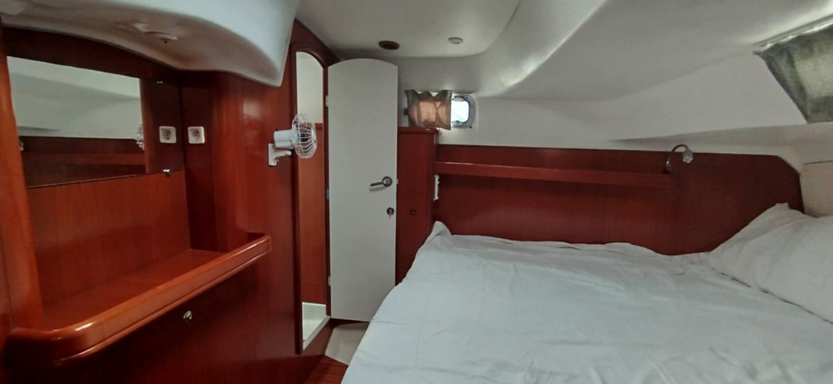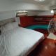 - Cabine arrière propriétaire : lit double (1,95 x 1,50 m) sur sommier à lattes, banquette, coiffeuse avec miroir et prise 220V, penderie, coffres, vaigrage capitonné, hauteur sous barrot 1,88 m.