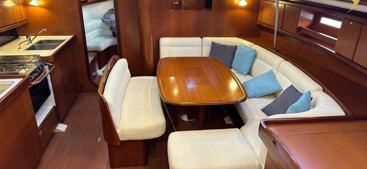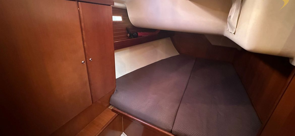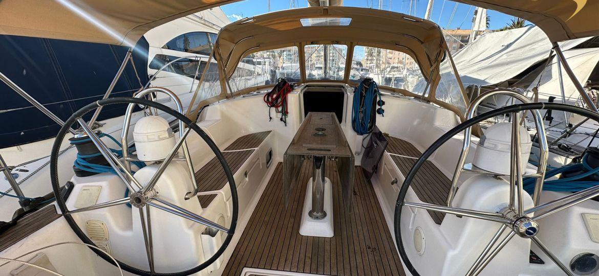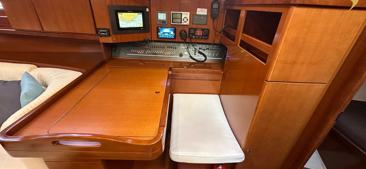 À bord, vous apprécierez une sellerie intérieure en bon état, ainsi que des boiseries parfaitement conservées, témoignant du soin constant apporté au bateau. L’équipement technique est complet et optimisé : double chargeur de batteries, double commande de pilote automatique (tribord et bâbord), moniteur de batteries, bout-dehors inox, et winch électrique facilitant les manœuvres.