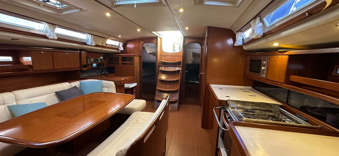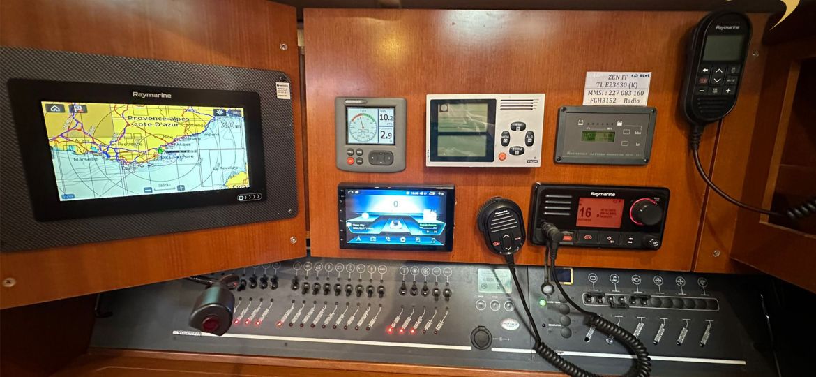 Le voilier bénéficie d’un mât long, d’un génois 140%, d’un frein de bôme, ainsi que de deux holding tanks. La chaîne a été remplacée en 2024 (50 mètres), tout comme le joint de sail drive et le coude d’échappement, garantissant une mécanique saine et fiable. La révision de la survie est programmée pour 2028.