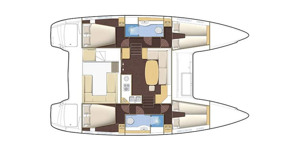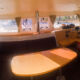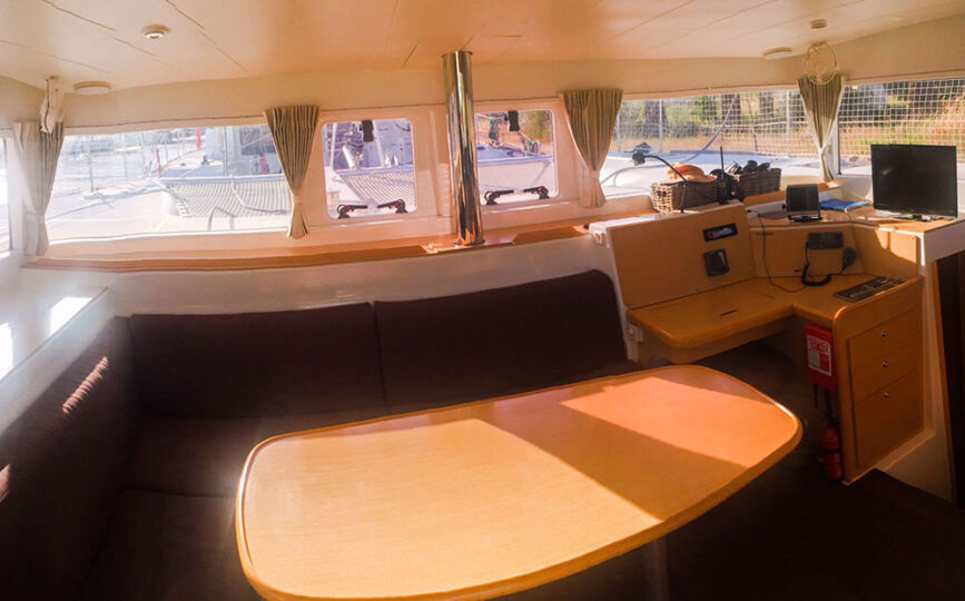 Le carré intérieur est conçu pour avoir une vue sur la mer à 360°.La cuisine est orientée vers l’arrière du bateau et offre une vue imprenable sur les mouillages ou pendant la navigation. Des penderies et tiroirs de rangements sont présents dans chacune des 4 cabines.